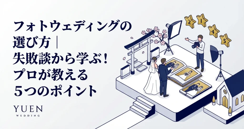 そこで、この記事では、フォトウェディングで後悔しないためのポイントを5つに絞って解説します。スタジオ選びから衣装選び、撮影当日の注意点まで、具体的なアドバイスを交えながら、失敗しないフォトウェディングの進め方をご紹介します。フォトウェディングの基礎知識については「フォトウェディング完全ガイド2026年版」もあわせてご覧ください。この記事を参考に、最高の思い出となるフォトウェディングを実現してください。
