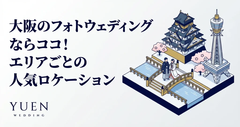 この記事では、エリアごとの魅力的なロケーションや、フォトウェディングを成功させるためのヒントをご紹介します。フォトウェディングの基礎知識については「フォトウェディング完全ガイド2026年版」もあわせてご覧ください。大阪で最高の思い出を写真に残すお手伝いができれば幸いです。