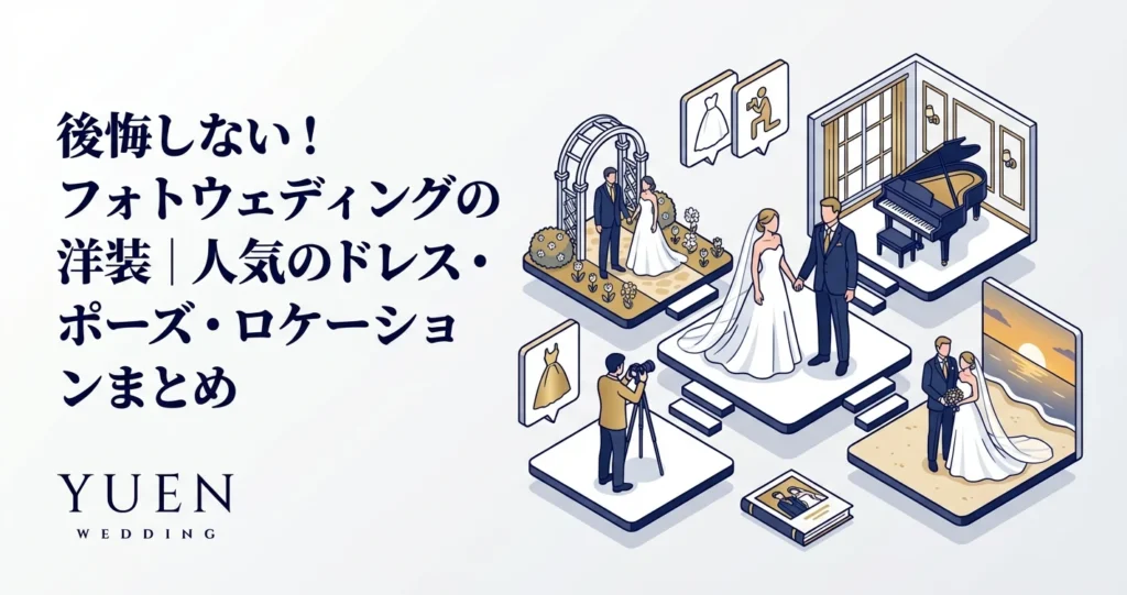 フォトウェディングは、結婚式の記念としてだけでなく、結婚の報告を兼ねた写真撮影や、結婚記念日の思い出作りなど、様々なシーンで選ばれています。フォトウェディングの基礎知識については「フォトウェディング完全ガイド2026年版」もあわせてご覧ください。これからフォトウェディングを検討されている方は、ぜひこの記事を参考に、理想の洋装スタイルを見つけてください。