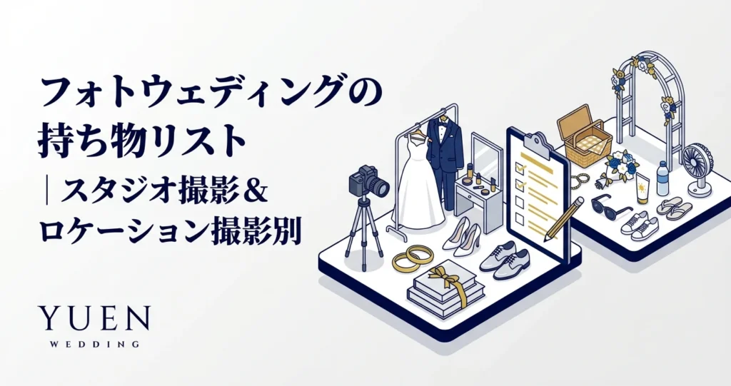 スタジオ撮影、ロケーション撮影問わず、フォトウェディングで必ず必要な持ち物をリストアップしました。事前の準備でスムーズな撮影を実現しましょう。