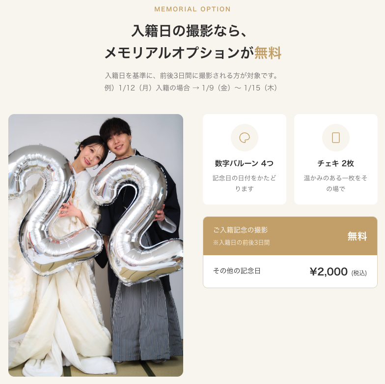 入籍日の前後3日間の方にメモリアルオプションをYUEN WEDDINGではプレゼントしています。