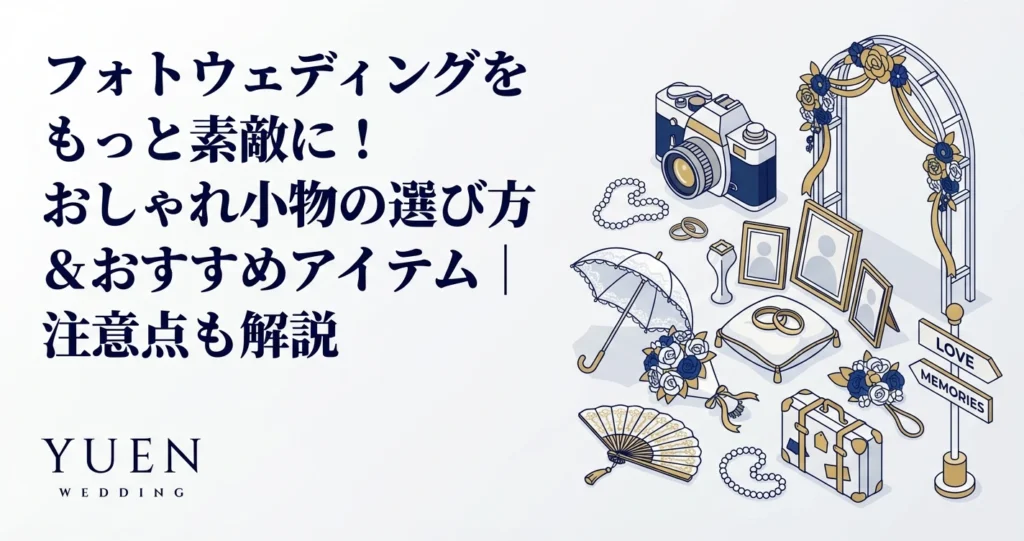 一生に一度の大切な思い出となるフォトウェディング。フォトウェディングの基本については「フォトウェディング完全ガイド2026年版」をご参照ください。最高の瞬間を写真に残すためには、衣装選びはもちろんのこと、小物選びも重要なポイントです。こだわりの小物を使うことで、お二人の個性を表現したり、写真の雰囲気をがらりと変えたりすることができます。