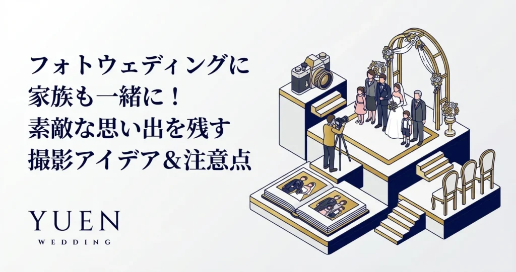 \n\n\n\n家族みんなでフォトウェディングを楽しみたい方には、YUEN WEDDINGのセルフフォトもおすすめです。完全プライベートの空間で、お子さまもご両親も周囲を気にせず自然体で撮影できます。東京/六本木・大阪/梅田・名古屋/栄の3店舗で衣装着放題・全データ当日お渡し。和装での家族フォトは和 -nagi-(東京/恵比寿)でも撮影可能です。