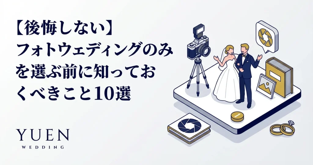 近年、結婚式を挙げずに「フォトウェディングのみ」を選択するカップルが増加傾向にあります。フォトウェディングの基本については「フォトウェディング完全ガイド2026年版」をご参照ください。