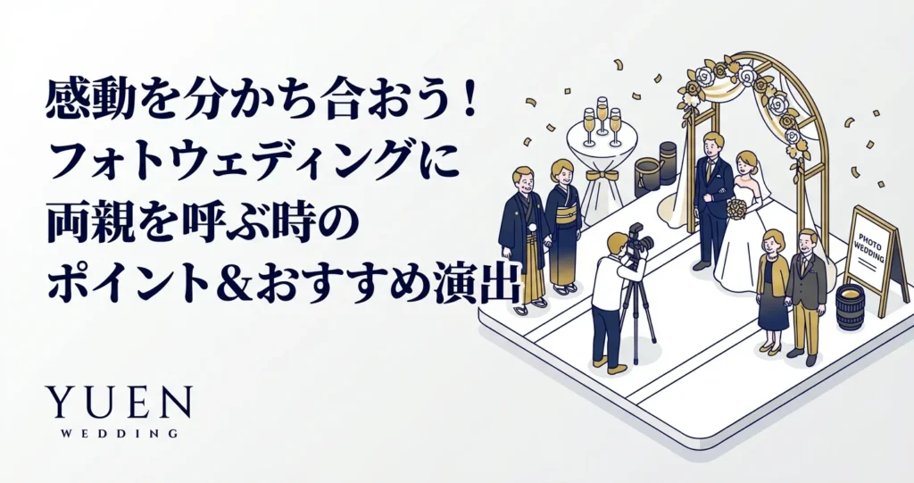 フォトウェディングは、写真を通して一生の思い出を形に残す特別な機会です。フォトウェディングの基本については「フォトウェディング完全ガイド2026年版」をご参照ください。最近では、この大切な瞬間に両親を招待するカップルが増えています。両親を呼ぶことで得られるメリットは、想像以上に大きいものです。 一体どんなメリットがあるのでしょうか? これからフォトウェディングを検討しているお二人に向けて、両親を呼ぶことのメリットをご紹介いたします。