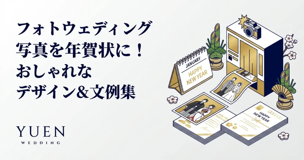 フォトウェディングの写真を使った年賀状は、人生の新たな門出を祝うと同時に、新しい年への希望に満ちたメッセージを伝えることができます。フォトウェディングの基礎知識を知りたい方は「フォトウェディング完全ガイド2026年版」も参考にしてください。大切な瞬間を捉えた一枚の写真は、受け取る方にも幸せな気持ちをお届けできるでしょう。