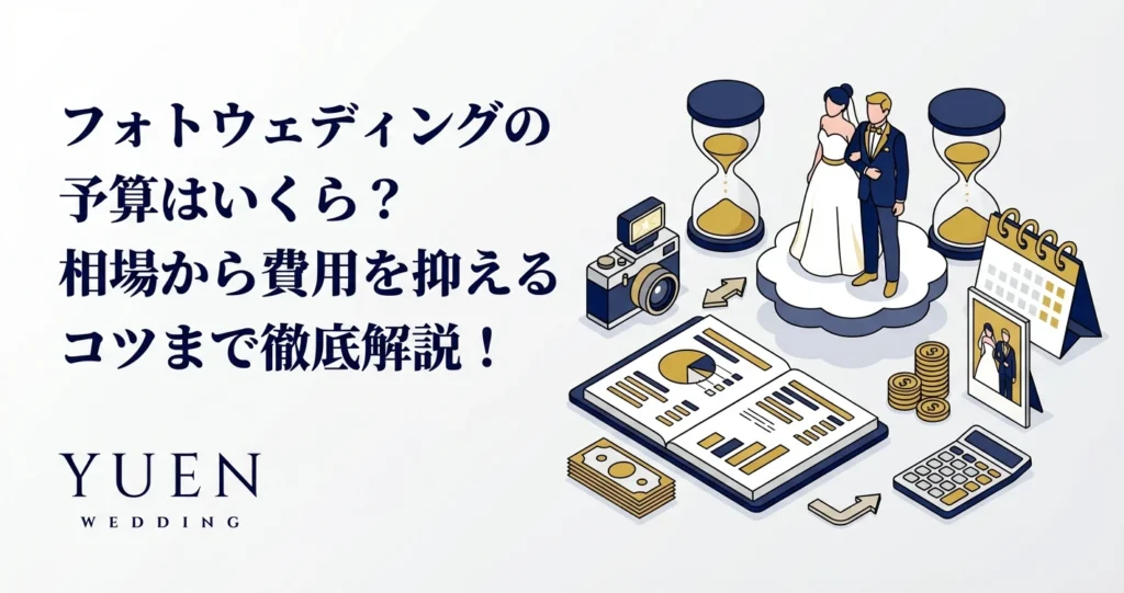 しかし、フォトウェディングを検討する上で「予算」は重要な要素です。 費用はプラン内容やオプションの選択によって大きく変動します。 予算を事前にしっかりと把握しておくことで、安心してフォトウェディングを進めることができます。 この章では、フォトウェディングの費用相場や、予算を抑えるためのコツなどを詳しく解説していきます。フォトウェディング全般についてはフォトウェディング完全ガイド2026年版もあわせてご覧ください。理想のフォトウェディングを実現するために、まずは予算について理解を深めていきましょう。