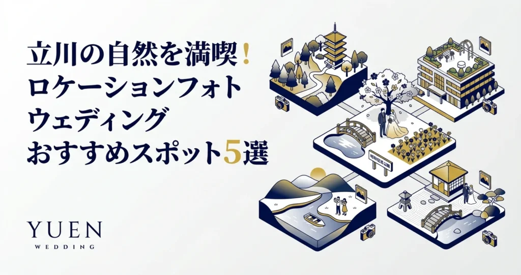 この記事では、立川でおすすめのフォトウェディングスポットを5つ厳選してご紹介します。フォトウェディング全般についてはフォトウェディング完全ガイド2026年版もあわせてご覧ください。それぞれのスポットの特徴やおすすめの撮影ポイント、アクセス方法などを詳しく解説していきますので、ぜひ参考にしてください。また、フォトウェディングを成功させるためのポイントも合わせてご紹介しますので、理想のフォトウェディングを実現するためにお役立てください。
