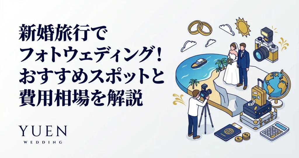 新婚旅行先でフォトウェディングを行う「旅フォト」プランが、近年人気を集めています。フォトウェディングの基本は「フォトウェディング完全ガイド2026年版」で解説しています。