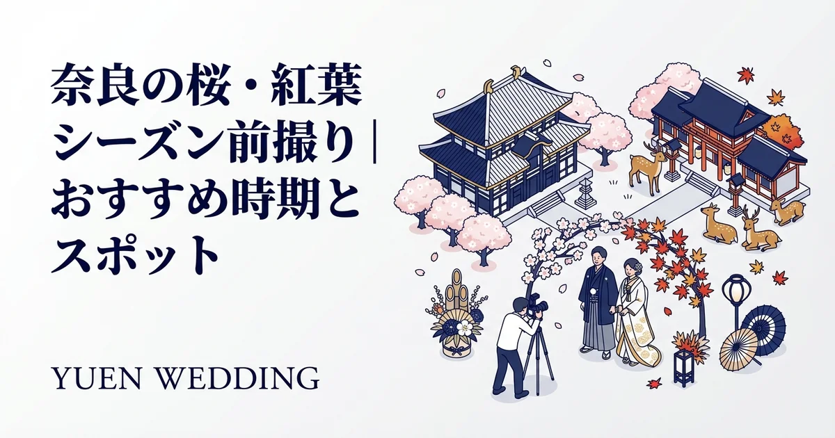 奈良の和装前撮りスポット8選|古都の趣を活かす撮影 奈良で和装前撮りをお考えのカップルに向けて、白無垢・色打掛が映える撮影スポットを厳選して紹介します。1300年の歴史を持つ古都・奈良には、神社仏閣か...