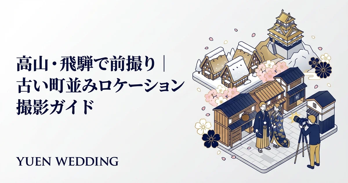 高山・飛騨で前撮り|古い町並みロケーション撮影ガイド 飛騨高山は、江戸時代の城下町の風情がそのまま残る岐阜県北部の人気観光地です。「古い町並み」と呼ばれる伝統的な町家が軒を連ねるエリアは、和装での前撮...