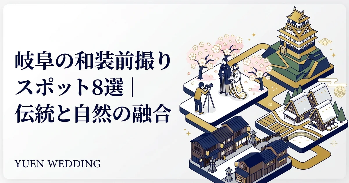 岐阜の和装前撮りスポット8選|伝統と自然の融合 岐阜県は、歴史ある神社仏閣と豊かな自然が調和した、和装前撮りに最適なエリアです。白無垢や色打掛といった日本の伝統的な婚礼衣装が映えるロケーションが、県内...