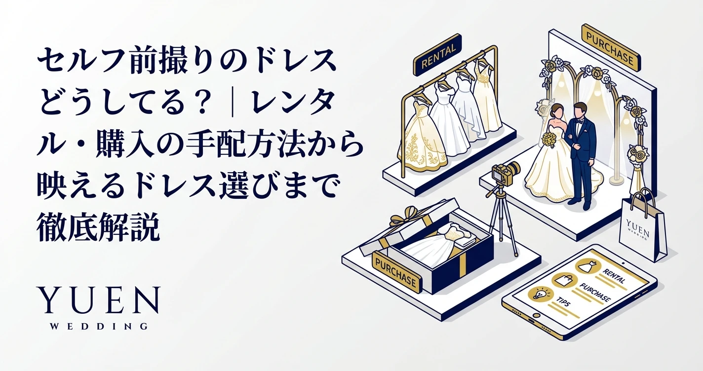 こんにちは。「YUEN WEDDING」です。 ふたりきりで手軽に撮影できることで人気の「セルフ前撮り」。ドレスはどこで、どう手配したら良いのでしょう?この記事ではさまざまなドレスの手配方法からシチュ...