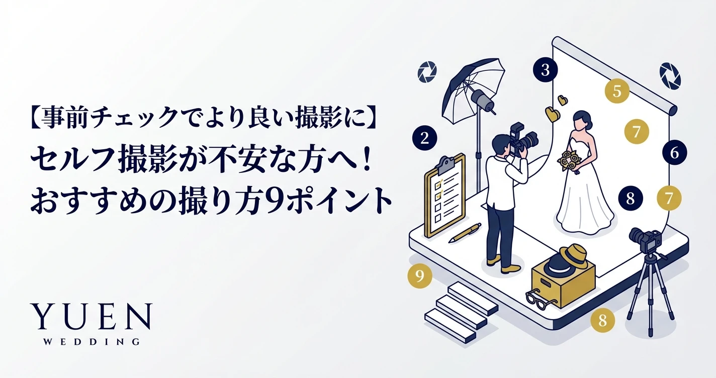2026年02月28日更新 【事前チェックでより良い撮影に】セルフ撮影が不安な方へ!おすすめの撮り方9ポイント セルフウェディングフォトスタジオ「yuen wedding」です。 セルフ撮影は自分たちで思い通りの撮影ができる反面、上手く撮れるか不安な点も多いかと思います。そんな方に向けて、事前に知っておきたい9...