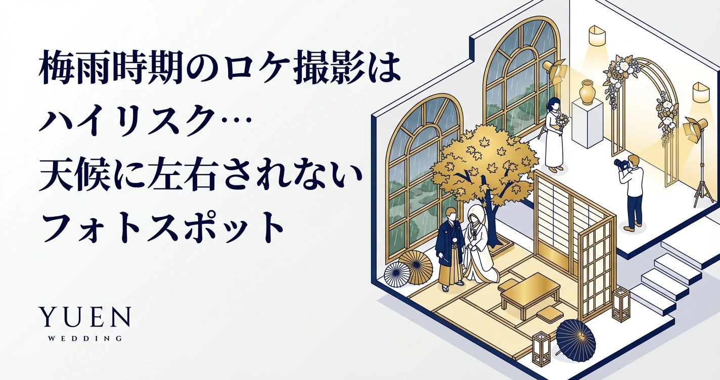 セルフウェディングフォトスタジオ「yuen wedding」です。梅雨時期の撮影は天候のリスクがありますよね。雨が少ない時期に撮ればいいとわかっていても、スケジュール的にそうはいかないこともあります。...