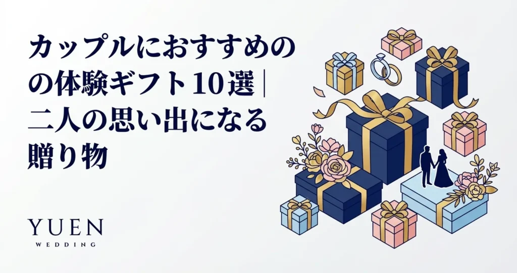 フォトウェディング体験(特にナシ婚カップルへ)、ディナーチケット、ホテルステイがおすすめ。「新しい門出を祝う」にふさわしい特別感のある体験を選びましょう。ペアギフトと組み合わせて、モノ+体験のセットで贈るのも効果的です。
