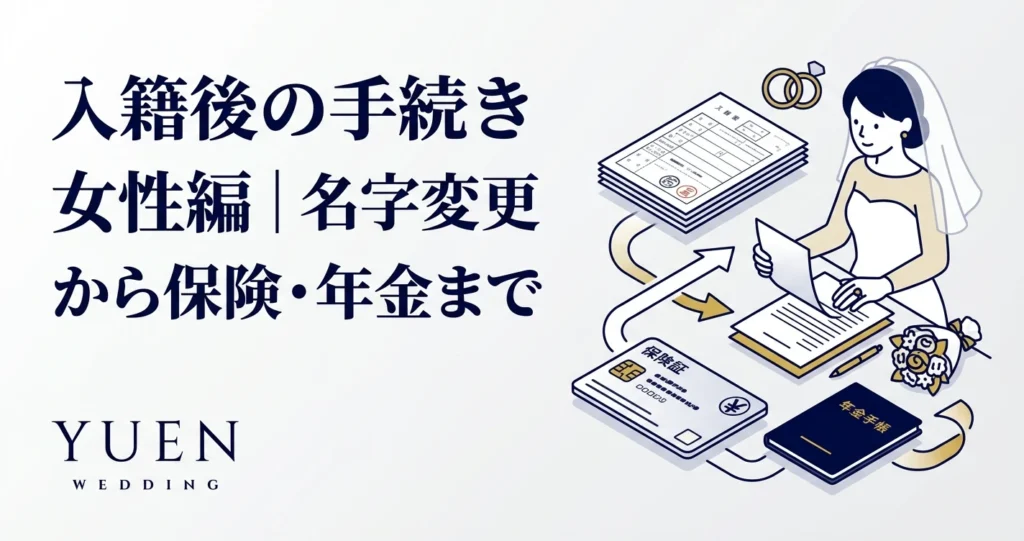 入籍後に女性が行う手続きを完全解説。名字変更、旧姓から新姓への移行手順、保険・年金の届出まで、働く女性・専業主婦別にチェックリスト付きで紹介。