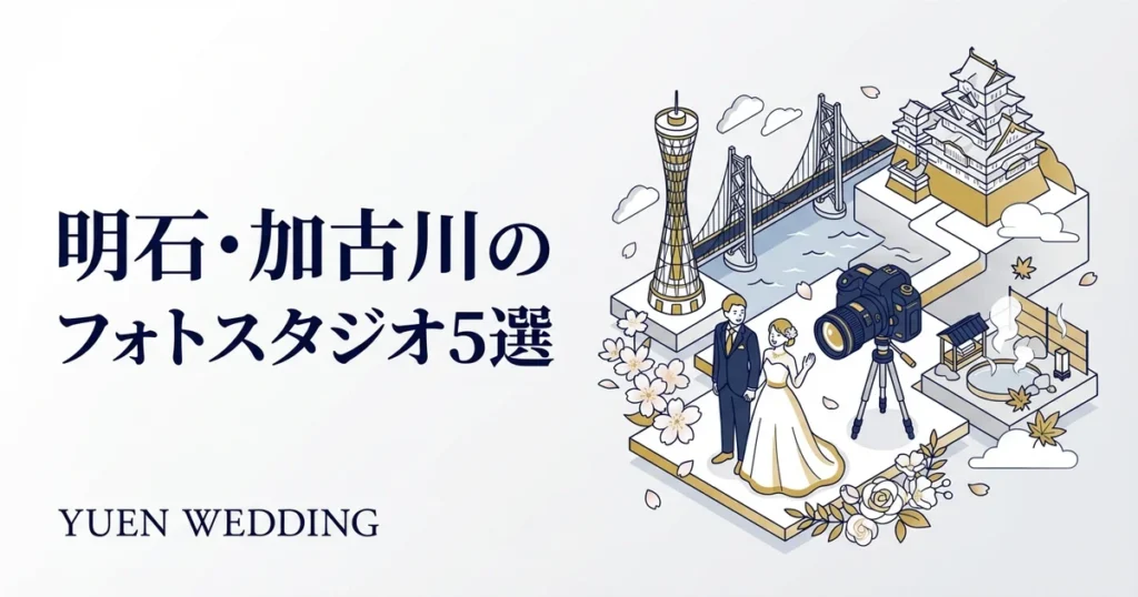 明石市内には大型のフォトウェディングスタジオは少ないため、神戸のスタジオに依頼してロケーション撮影を行うケースが一般的です。スタジオ情報は三宮・元町のフォトスタジオおすすめ8選をご参照ください。