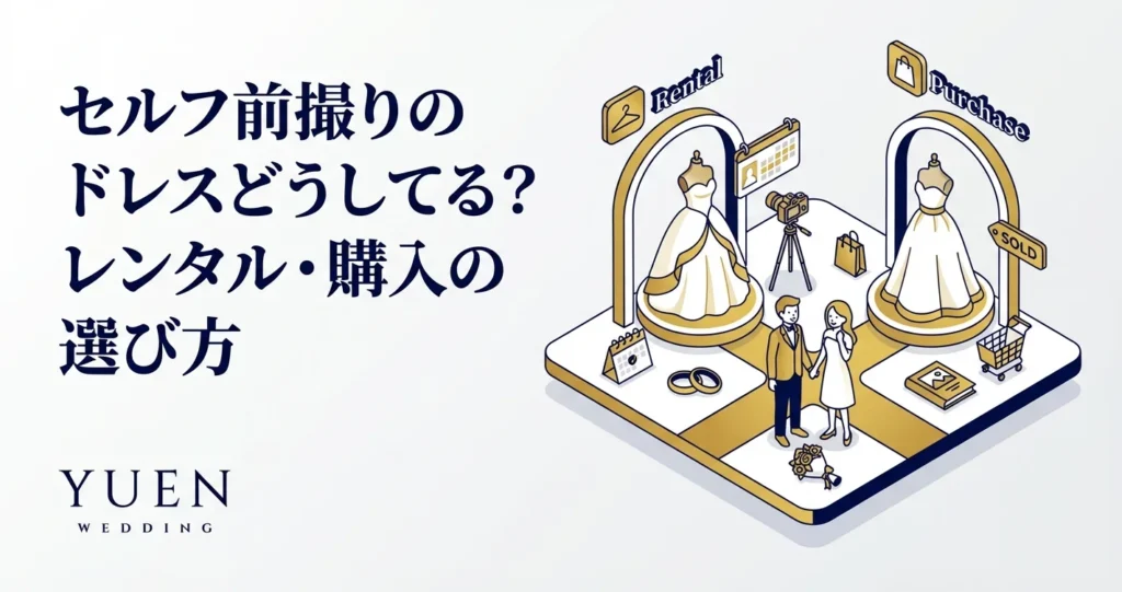セルフ前撮りの衣装選びを徹底解説。ドレスのレンタル・購入・私服それぞれのメリットと費用相場、映えるドレス選びのコツ、おすすめショップまで、衣装準備の疑問にすべてお答えします。