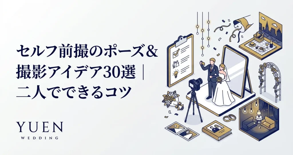 セルフ前撮りで使えるポーズ&撮影アイデア30選を紹介。定番の立ちポーズから面白い遠近法まで、二人だけで撮影するコツと、写真が苦手な人でも自然な表情になるテクニックを解説します。