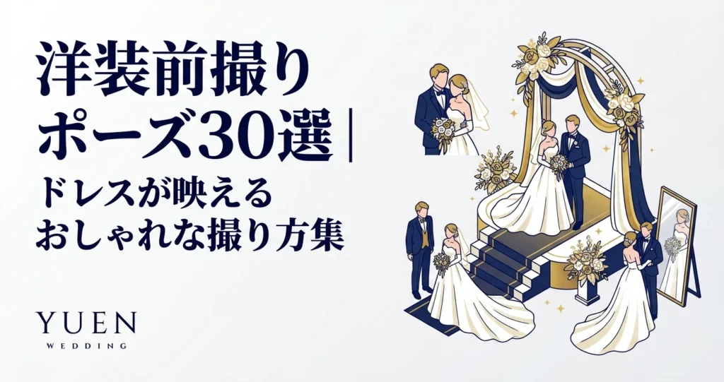 洋装前撮りポーズ30選を、Aライン・マーメイド・ふたりポーズ・ロケーション・小物の5カテゴリで紹介しました。