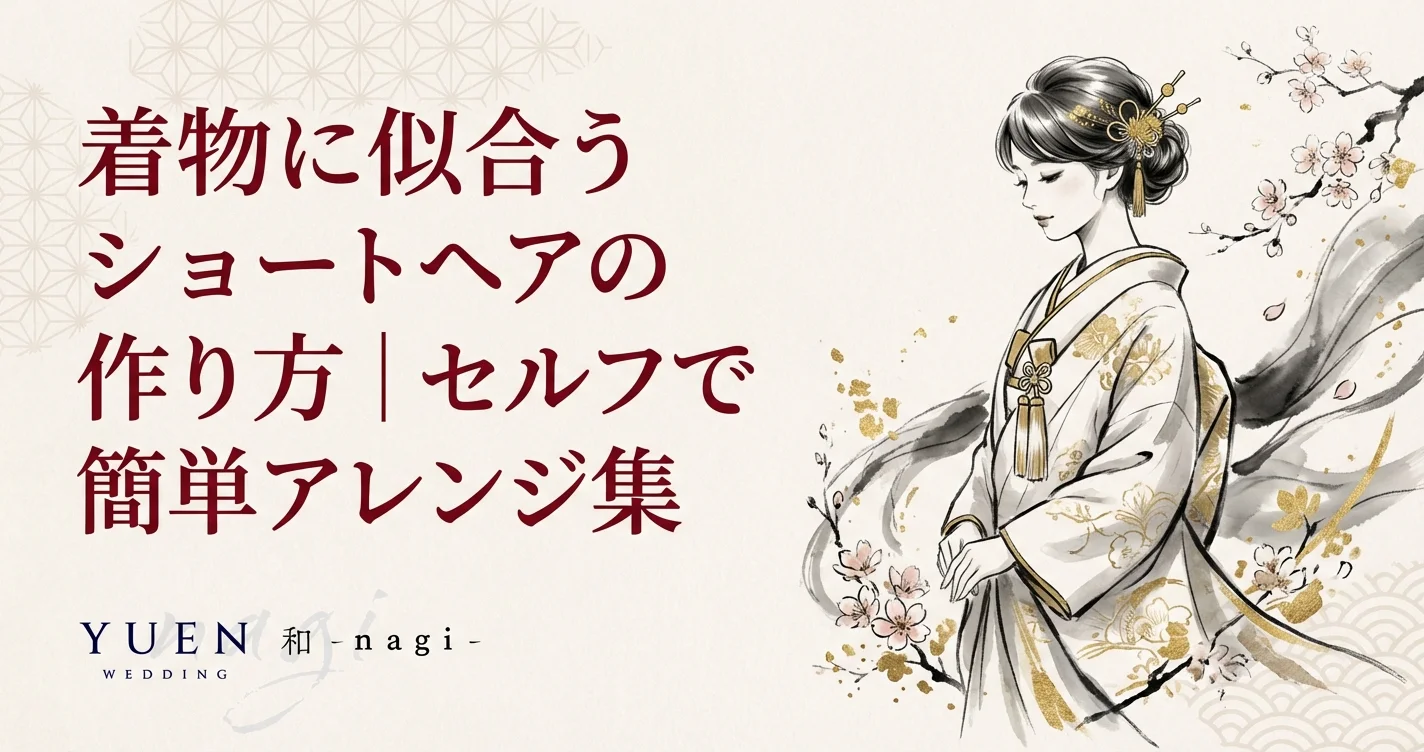 和-nagi-の前撮りでは、ショートヘアの花嫁さまも安心。プロの着付けがプラン内、ヘアセットはオプション(+¥8,000)で追加可能です。メイクは事前にお済ませいただくか、提携美容室をご利用ください。