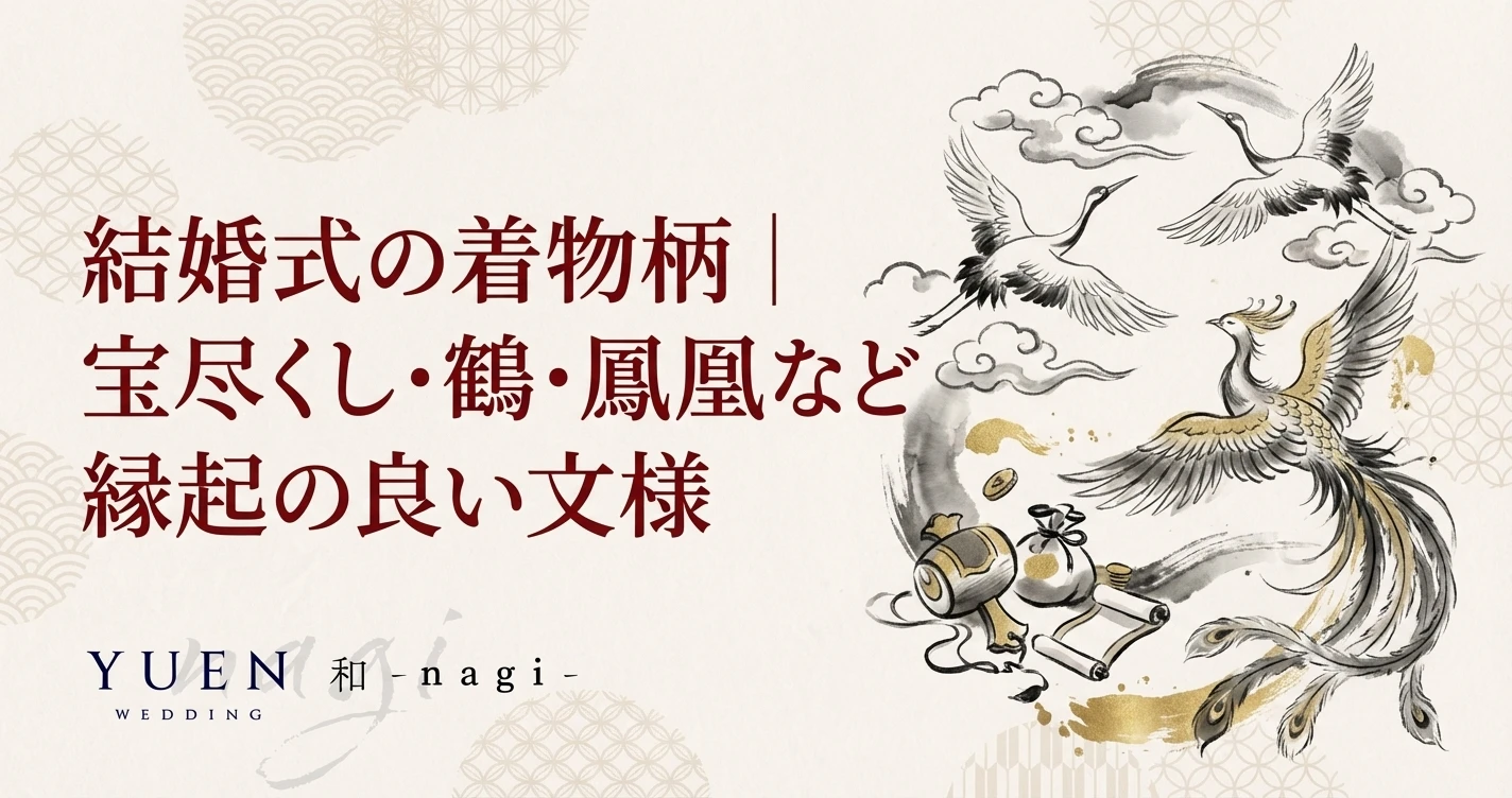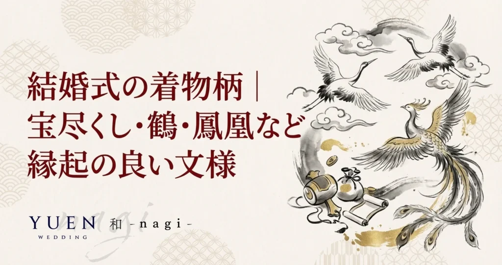 結婚式の着物柄には一つひとつ深い意味が込められています。鶴の「夫婦円満」、鳳凰の「繁栄」、松竹梅の「不変の絆」、宝尽くしの「あらゆる幸福」。