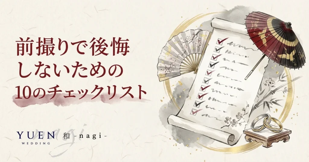 前撮りの後悔には明確なパターンがあり、事前のチェックで防げるものがほとんどです。この記事では、前撮りで後悔しがちな10のポイントをチェックリスト形式でまとめました。スタジオ選び・料金・撮影データ・衣装・ヘアメイク・持ち物・契約条件・パートナーとのすり合わせ・当日の体調管理・和装特有の注意点まで、やるべきことを網羅しています。このリストに目を通しておくだけで、当日の安心感が格段に変わります。