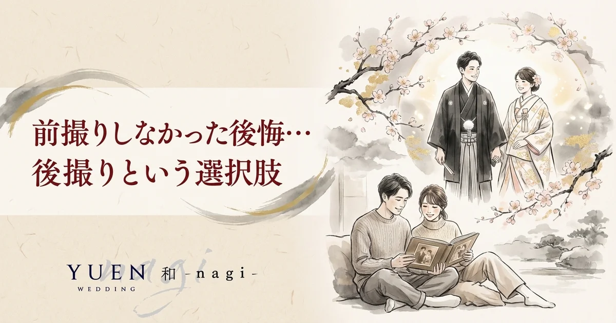 前撮りをしなかったことを後悔しているなら、「後撮り」という選択肢があります。後撮りは結婚後に花嫁衣装で撮影を行うもので、何年経っても遅くありません。この記事では、後撮りの仕組みやメリット、和装で撮影する魅力を詳しく解説します。
