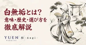 白無垢の意味・歴史・由来から選び方まで徹底解説。生地の種類(綸子・緞子・縮緬)、色の違い、柄の意味も紹介。凛とした白無垢姿を叶えるための完全ガイド。...