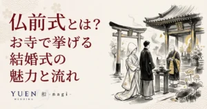 仏前式(ぶつぜんしき)とは、お寺の本堂で仏様とご先祖様の前に結婚を報告し、僧侶の導きのもと夫婦の誓いを立てる挙式スタイルです。念珠授与や焼香といった仏教独自の儀式が特徴で、厳かな雰囲気のなかで「ふたり...
