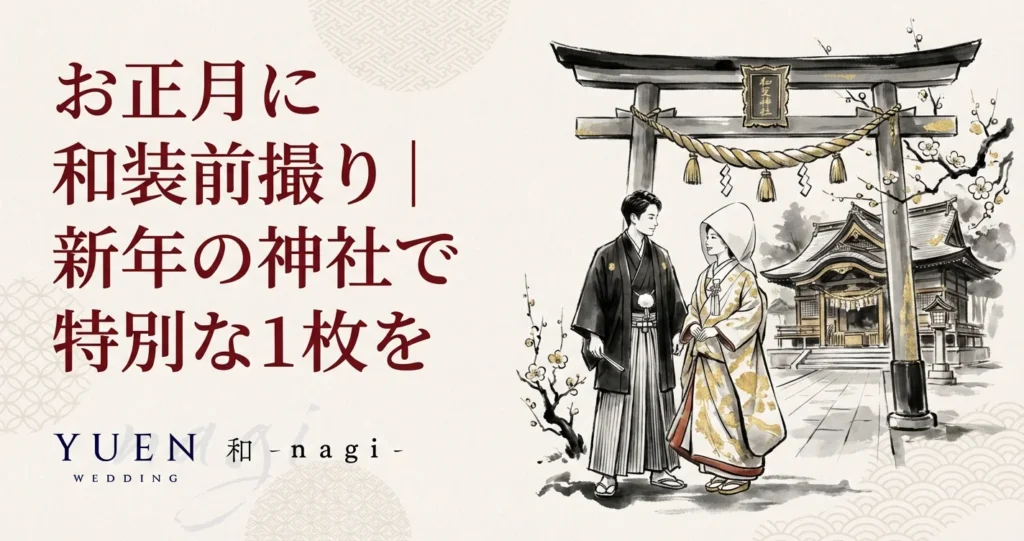 この記事では、お正月に和装前撮りをするメリット・注意点、おすすめの神社、新春キャンペーンの活用法まで詳しく解説します。季節選びの全体像は「和装前撮りのベストシーズンガイド」、冬の撮影については「冬の和装前撮り|雪景色ロケーション」もあわせてご覧ください。