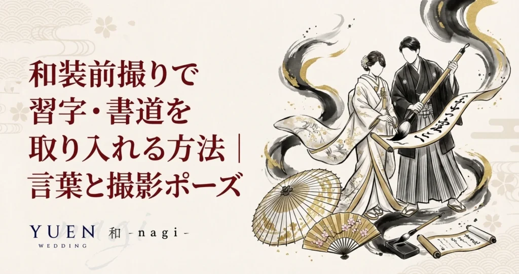 和装前撮りに習字・書道を取り入れるカップルが増えています。筆で書いた文字が持つ温かみや、和装との抜群の相性が人気の理由です。この記事では、前撮りで書く言葉の人気ランキングから、撮影ポーズ8選、字が苦手でもきれいに見せるコツ、道具の準備方法、そして撮影後の活用法までまとめました。