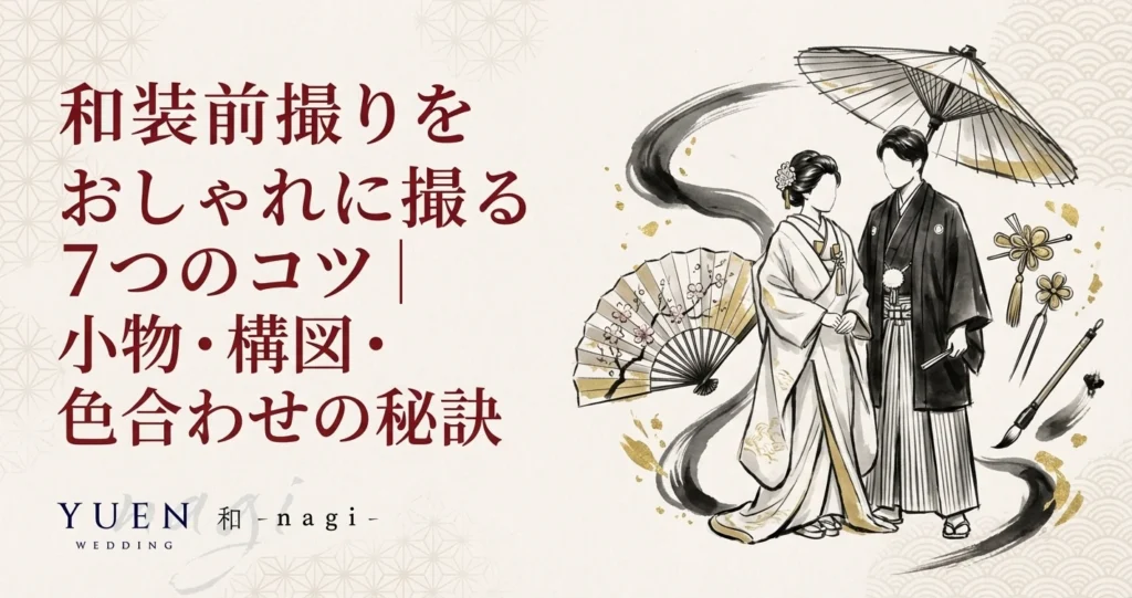 ポイントは1カットにつき小物は1〜2個までに絞ること。和装そのものが主役です。番傘や扇子はスタジオ備品として用意されていることも多いので、事前にスタジオに確認し、備品にないアイテムを手作り持ち込むのが効率的です。和装前撮りのポーズ集50選では小物を活かしたポーズも多数紹介しています。トレンドはゼクシィの和装前撮りアイテム特集も参考になります。