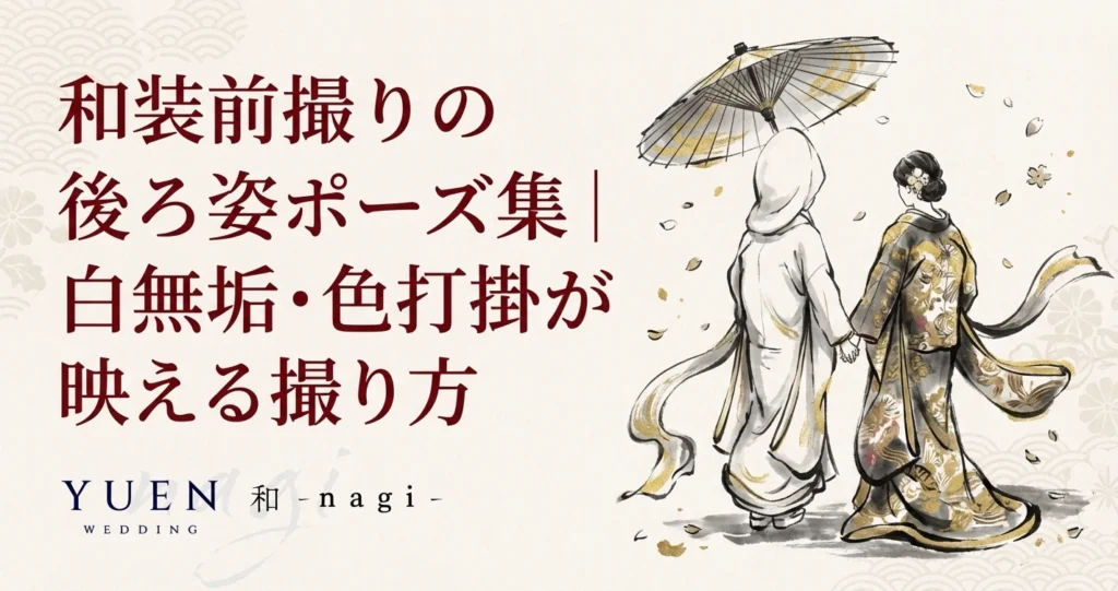和装前撮りで後ろ姿のカットを撮り忘れて後悔した、という声は少なくありません。白無垢や色打掛の魅力は正面だけでなく、背中の柄や帯結び、うなじのラインにも詰まっています。この記事では、和装前撮りの後ろ姿ポーズを二人撮り・ソロ・パーツ撮り別に13選紹介し、衣装別の撮り方のコツや美しく見せるためのポイントもお伝えします。