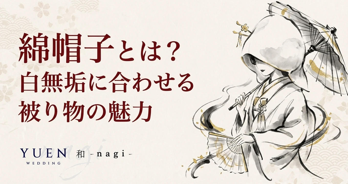 白無垢姿の花嫁が頭に被る白い被り物——綿帽子(わたぼうし)は、和装婚礼の中でも特別な存在感を持つアイテムです。「挙式まで新郎以外に顔を見せない」という意味を込めたその姿は、ウェディングドレスのベールにも通じる花嫁だけの特権。「結婚式では綿帽子をつけたかった」「前撮りで綿帽子の写真を残したい」という花嫁も多く、和装前撮りの定番のひとつです。